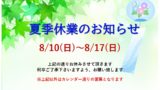 2024夏季休業のお知らせ お知らせ(店舗共通) 2024.08.05 上記の通り、休業いたします。 長野店・長野南店共通となります。 休業期間の前後は、ご希望の時間にご予約が取れない可能性があります。 何卒ご了承ください。